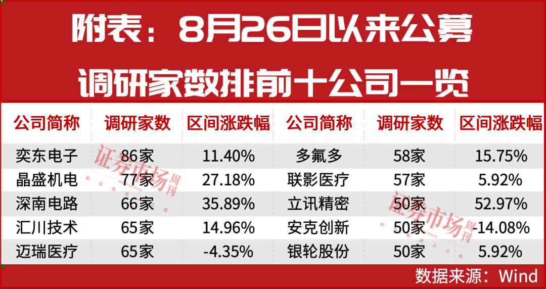 由于半年报时点的组合距今有一定时滞,公募基金近期调研公司比拟更具参考意念念。Wind资讯自满,从8月28日到9月24日,恰好排在公募基金调研派系前10位的公司齐跨越了50家,它们区分是奕东电子、晶盛机电、深南电路、迈瑞医疗、汇川本事、多氟多、联影医疗、立讯精密、安克翻新、银轮股份。这其中在近期推崇最佳确当数立讯精密,其在9月以来也曾有两个往来日出现涨停。